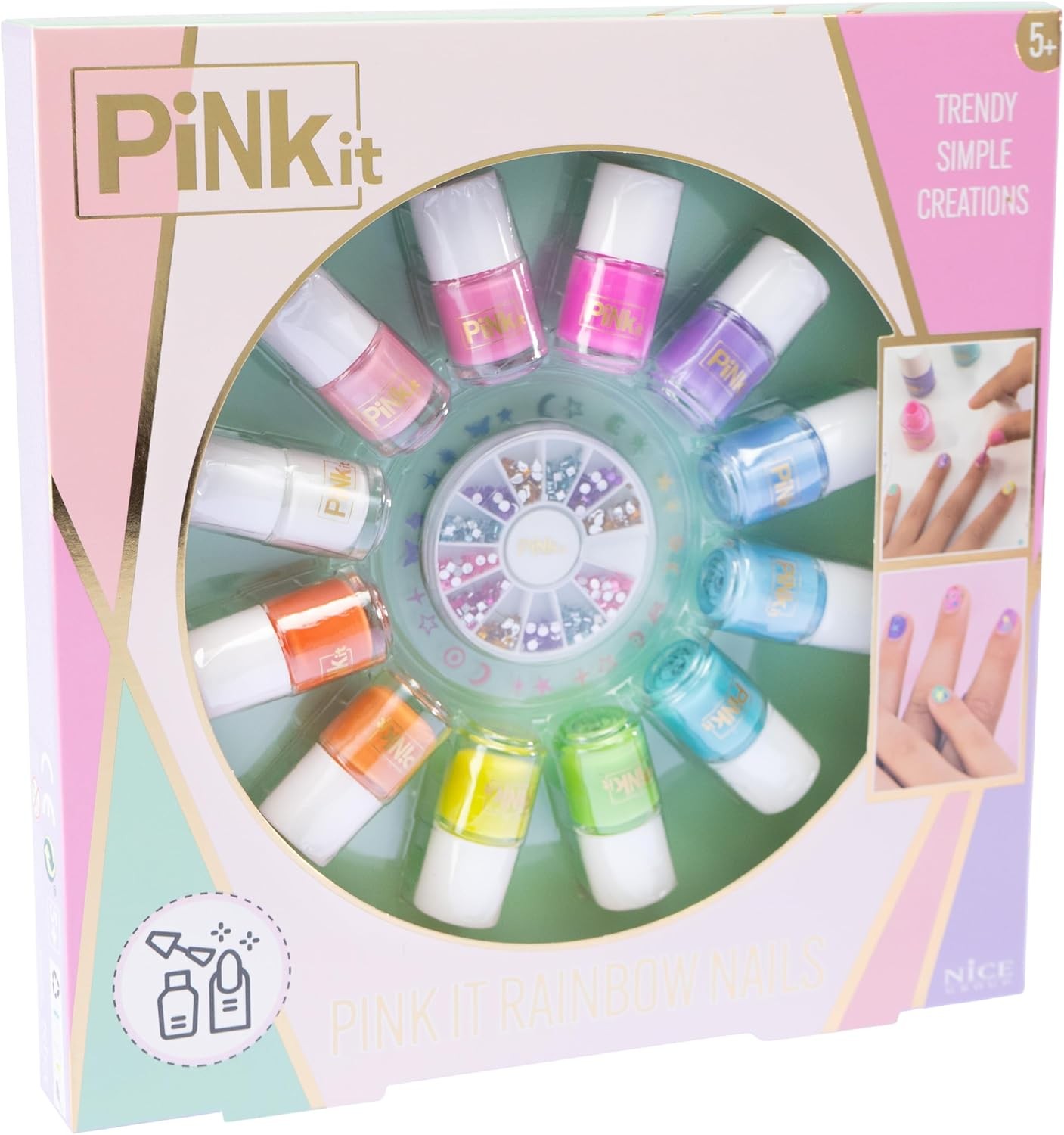 Con il set PINKIT Rainbow Nails ogni bambina può divertirsi a decorare le unghie e creare look alla moda in perfetto stile Pink It. Il kit include tutto il necessario per una nail art colorata e fantasiosa, con smalti sicuri e adesivi decorativi. Gli smalti sono formulati senza parabeni, atossici e facilmente rimovibili con solvente senza acetone, mentre gli adesivi si eliminano con acqua e sapone. Un gioco creativo ideale per sviluppare manualità e immaginazione, perfetto anche per feste e compleanni.