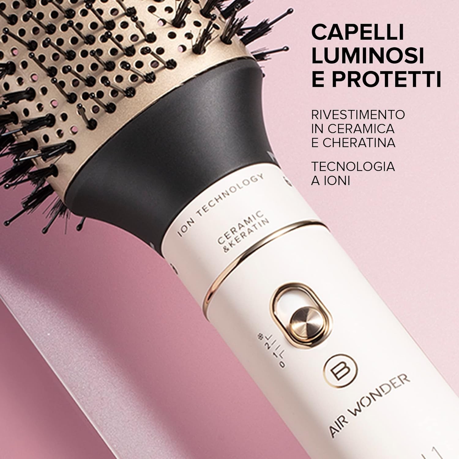 La tecnologia a ioni aiuta a mantenere l’idratazione dei capelli, riducendo l’effetto crespo e donando morbidezza. Il rivestimento in ceramica e cheratina protegge i capelli dal calore e regala una luminosità immediata, rendendoli più setosi e vitali.