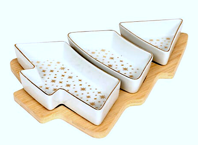 SET APERITIVO ALBERO 3 CIOTOLE CERAMICA CON VASSOIO BAMBOO