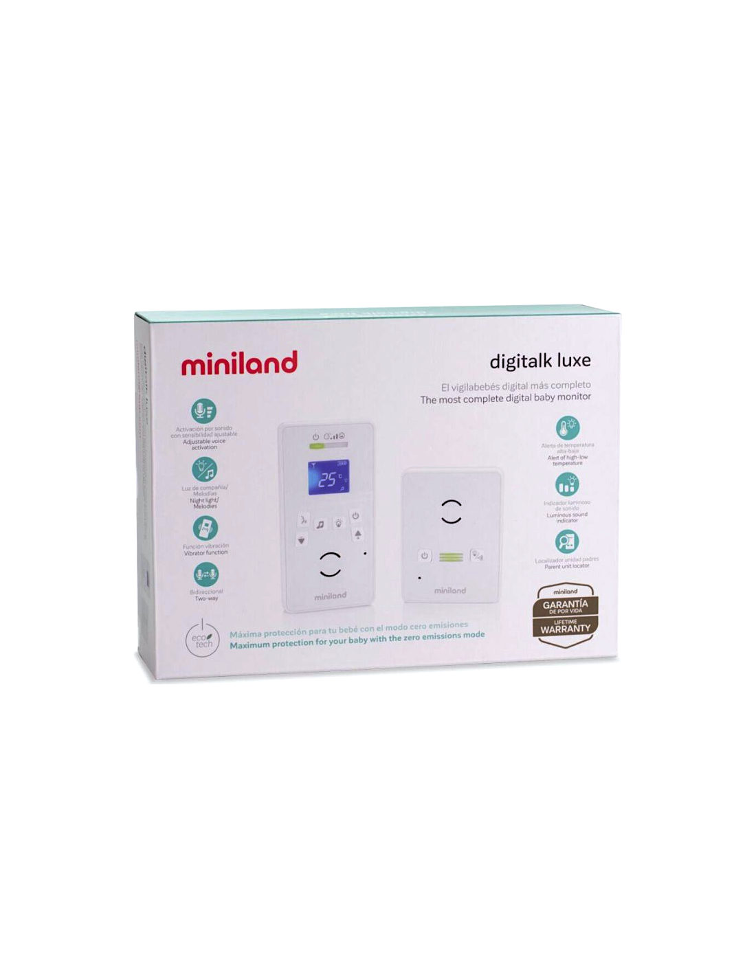 Il Baby Monitor Miniland DigitalK Luxe offre un audio di alta qualità senza interferenze, con una portata fino a 300 metri. Dotato di tecnologia bidirezionale, permette di ascoltare il bambino e comunicare con lui. Dispone di attivazione vocale, modalità vibrazione per ambienti silenziosi, luce di compagnia e cinque melodie rilassanti. Il termometro integrato consente di monitorare la temperatura della stanza direttamente dallo schermo, garantendo il massimo comfort per il bambino.