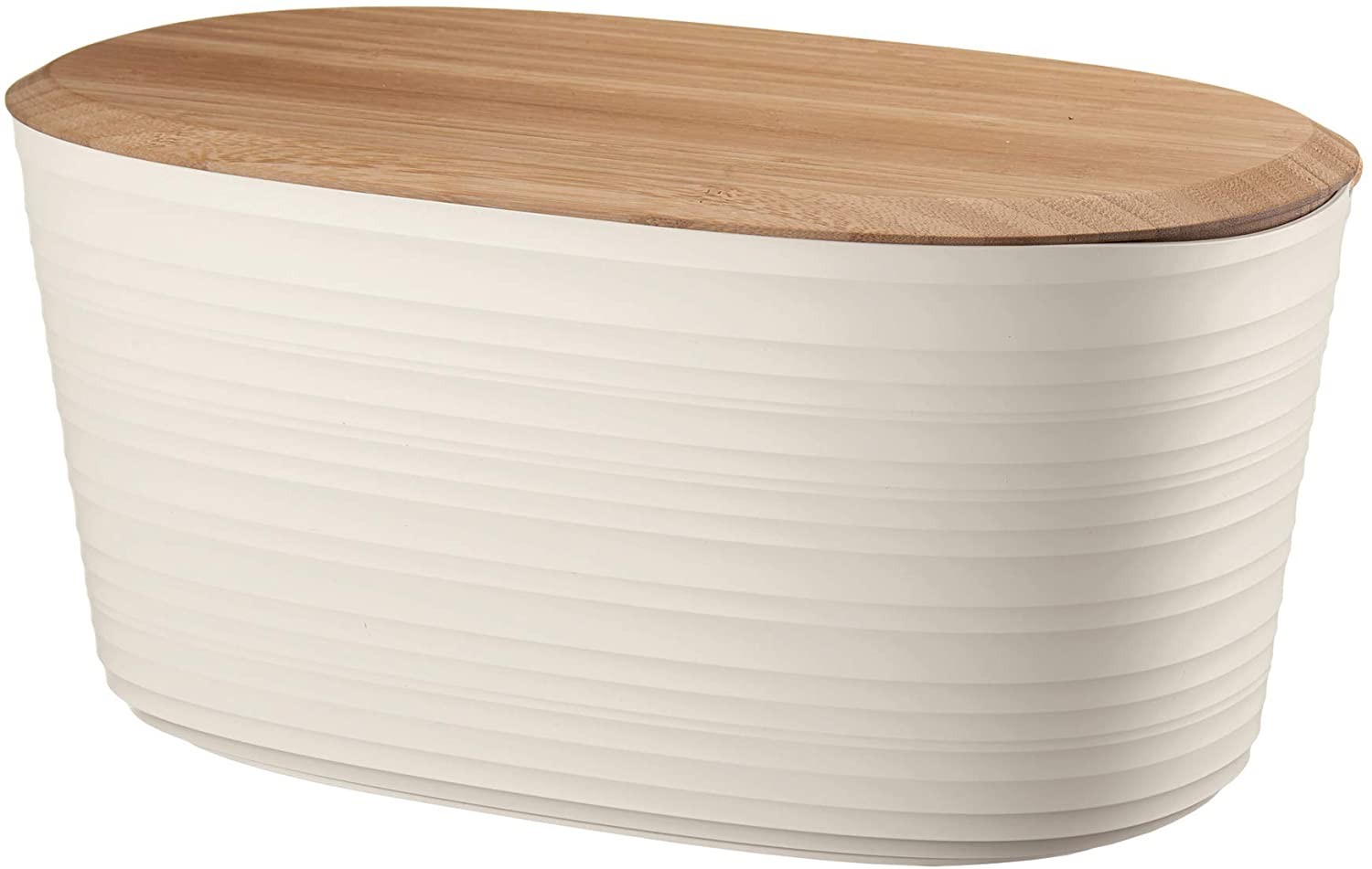 Cassetta pane realizzata riciclando 26,8 bottiglie d'acqua usa e getta 100% post consumo. Il coperchio è in legno di bamboo. La versatilità dell'oggetto lo rende anche un ottimo organizzatore da cucina.